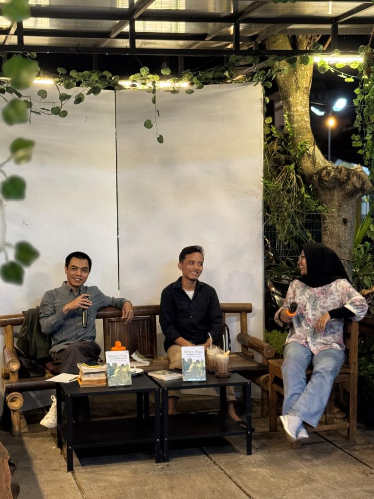 Buku White Flag: Seni Melawan Toxic menjadi pintu masuk bagi perbincangan malam itu. R. Nanino, penulisnya, tidak datang membawa resep atau slogan penguat. Ia datang dengan cerita—tentang kelelahan yang tidak selalu bisa dijelaskan, tentang relasi yang menggerogoti perlahan, dan tentang keberanian untuk berhenti sebelum diri sendiri runtuh sepenuhnya. Dalam penuturannya, mengibarkan bendera putih bukanlah tanda kalah, melainkan kesadaran bahwa hidup tidak selalu harus dimenangkan dengan cara melukai diri sendiri.